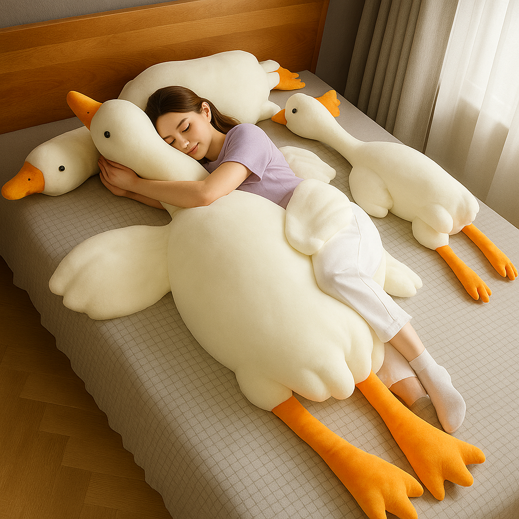 Com toque extremamente macio e fofo, esse ganso gigante traz sensação de abraço real, sendo ideal para dormir agarradinho, aliviar o estresse e deixar o ambiente ainda mais charmoso.